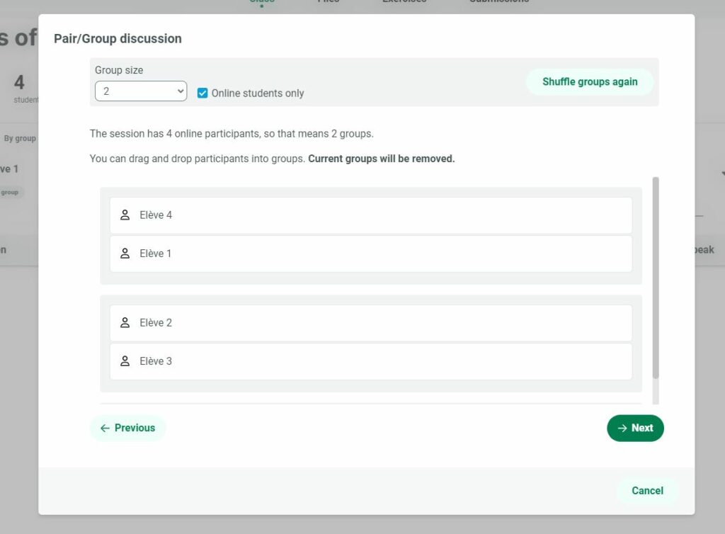Vous pouvez laisser le choix des participants à Connect en cliquant sur Shuffle groups again ou déplacer les cartes de vos élèves afin de réorganiser vos paires/groupes.