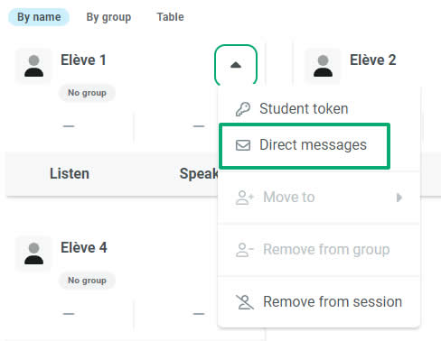 Pour envoyer un message à un élève particulier, il suffit d’ouvrir son menu et de sélectionner Direct messages.