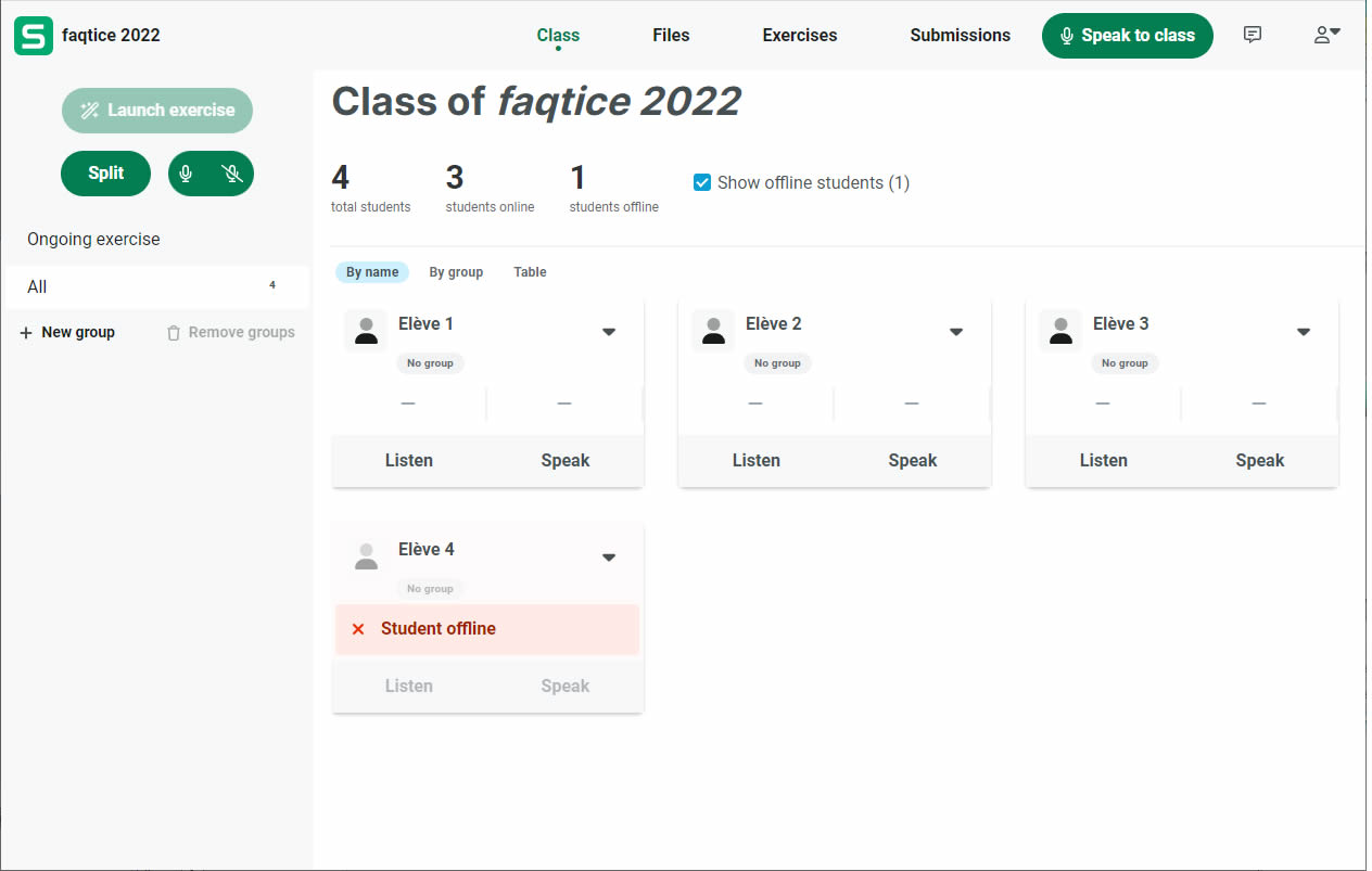 L’enseignant peut basculer entre l’activité exercice et les vues de la classe ou des groupes en cliquant sur l’onglet correspondant sur la gauche de l’écran :