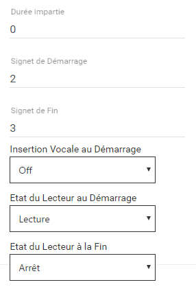 Les champs Etat du Lecteur au Démarrage et Etat du Lecteur à la Fin de l’activité vous permettent de commander le Magnétophone lorsque l’élève démarre l’exercice et lorsqu’il le termine.