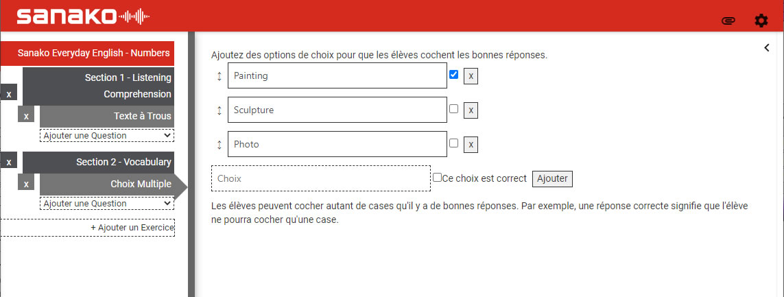 Cochez la case Ce choix est correct pour définir une bonne réponse. Vous pouvez sélectionner plusieurs réponses à des questions pour lesquelles plusieurs réponses sont possibles.