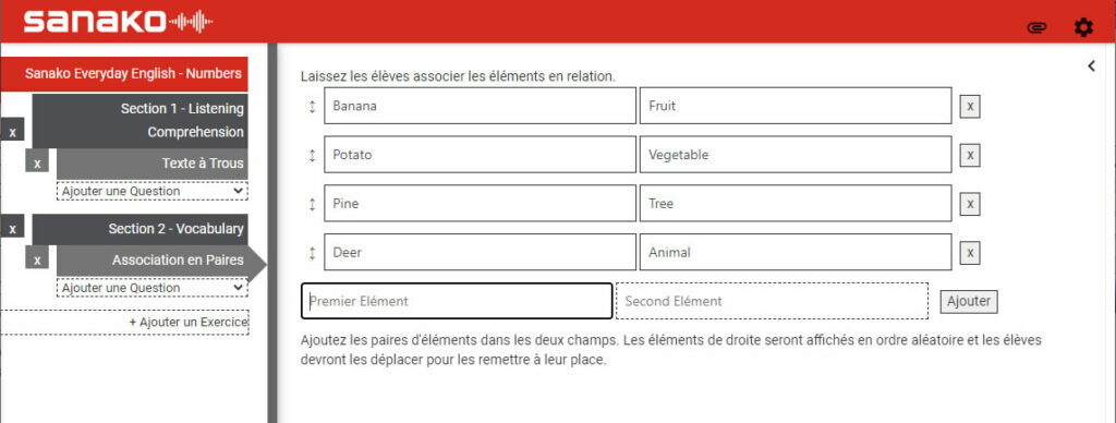 Dans l’activité Association en Paires, les élèves doivent faire glisser des éléments afin d’associer des mots ou des phrases.