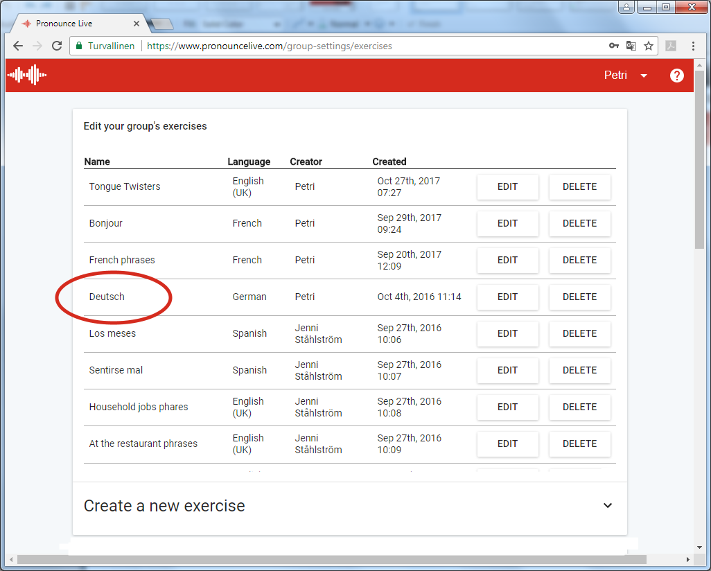 Pour gérer les exercices du groupe, sélectionnez Exercices(Exercises) à partir du menu de Pronounce Live.