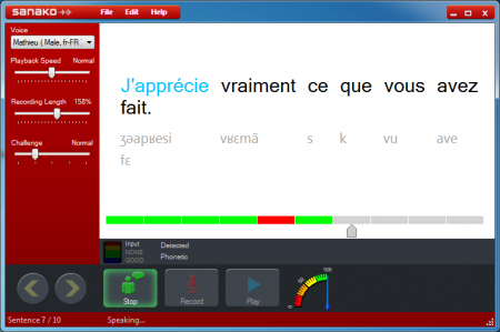 Sanako Pronounce est une solution logicielle simple à utiliser destinée à améliorer les compétences orales dans une langue étrangère. Pronounce associe à la fois la synthèse vocale et la reconnaissance vocale ; la synthèse vocale permet de transformer n’importe quel texte en document audio qui servira de modèle aux utilisateurs, qui pourront ensuite s’enregistrer, la reconnaissance vocale permet de traduire le modèle en phonétique et d’évaluer la prestation de l’utilisateur. Les voix de haute qualité proposées par Sanako reproduisent un accent authentique, permettant de créer de superbes modèles pour les apprenants.