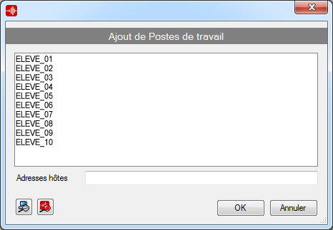 Si vous avez laissé tourner Pronounce sur les ordinateurs élèves, vous pouvez simplement sélectionner tous les PCs de la liste et les ajouter. Au cas où vous ne trouvez pas un ordinateur particulier, vous pouvez l’ajouter en tapant son adresse dans le champ Adresses hôtes.