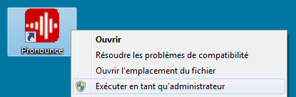 Installez Pronounce sur les ordinateurs élèves en lançant l’exécutable d’installation PronounceInstaller.exe. Utilisez votre licence Sanako Pronounce pour activer le logiciel. Ensuite, il vous faudra démarrer Pronounce en mode Administrateur. Faites un clic droit sur l’icône de Pronounce et sélectionnez « Exécuter en tant qu’administrateur ».