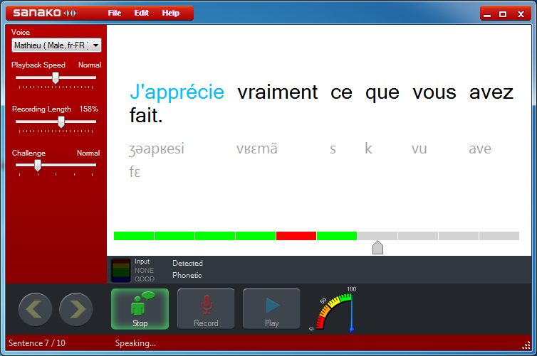 Pronounce affichera ensuite dans le vumètre le score correspondant à l’évaluation globale de la phrase. Chaque mot est également affiché selon un code de couleurs :