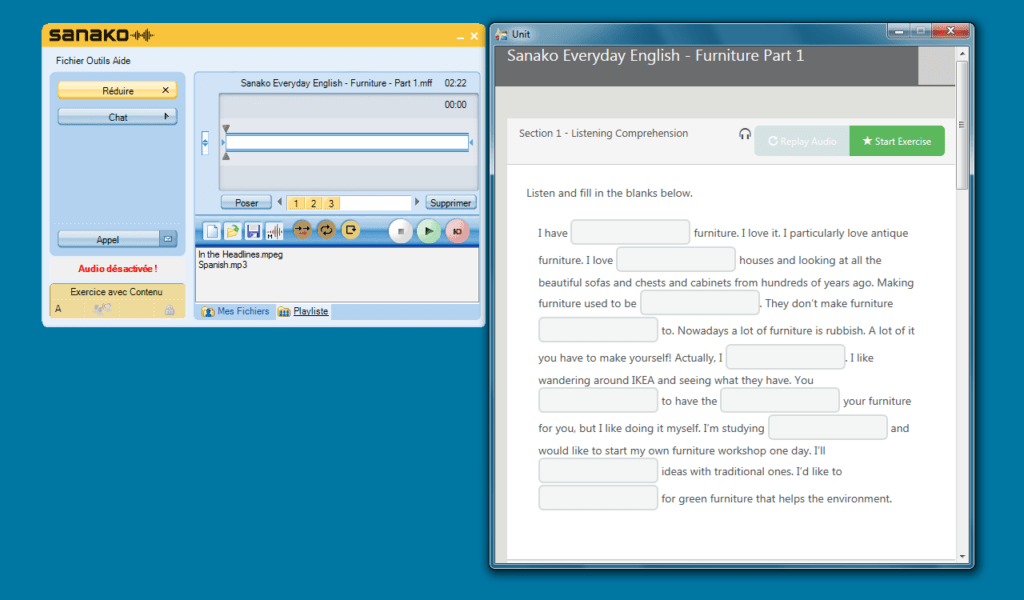 Cette activité vous permet de lancer des fichiers de contenu directement aux élèves. Ceci ouvrira une fenêtre d’exercice à côté des magnétophones élèves, à partir de laquelle ils pourront accéder au matériel, réaliser des exercices et utiliser le magnétophone en lecture ou en enregistrement.