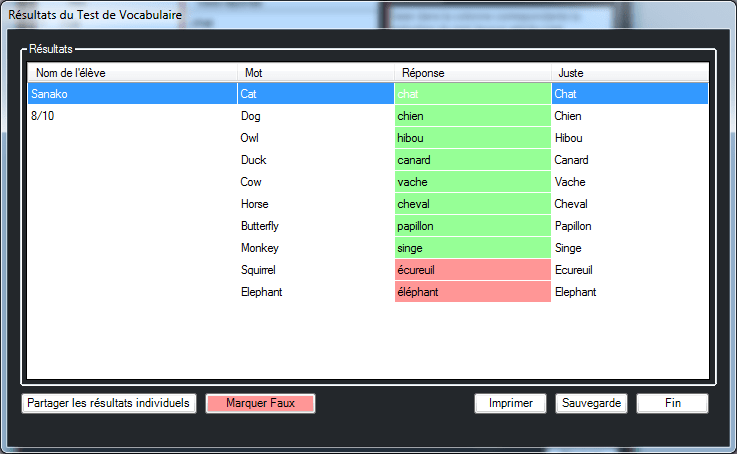 Une fois le Test terminé, une nouvelle fenêtre permettra au professeur de voir les résultats de chaque élève. La fenêtre ci-dessous montre le résultat pour un élève. Les réponses Justes sont affichées dans une boite verte, les réponses Fausses dans une boite rouge. Un score est indiqué pour chaque élève.