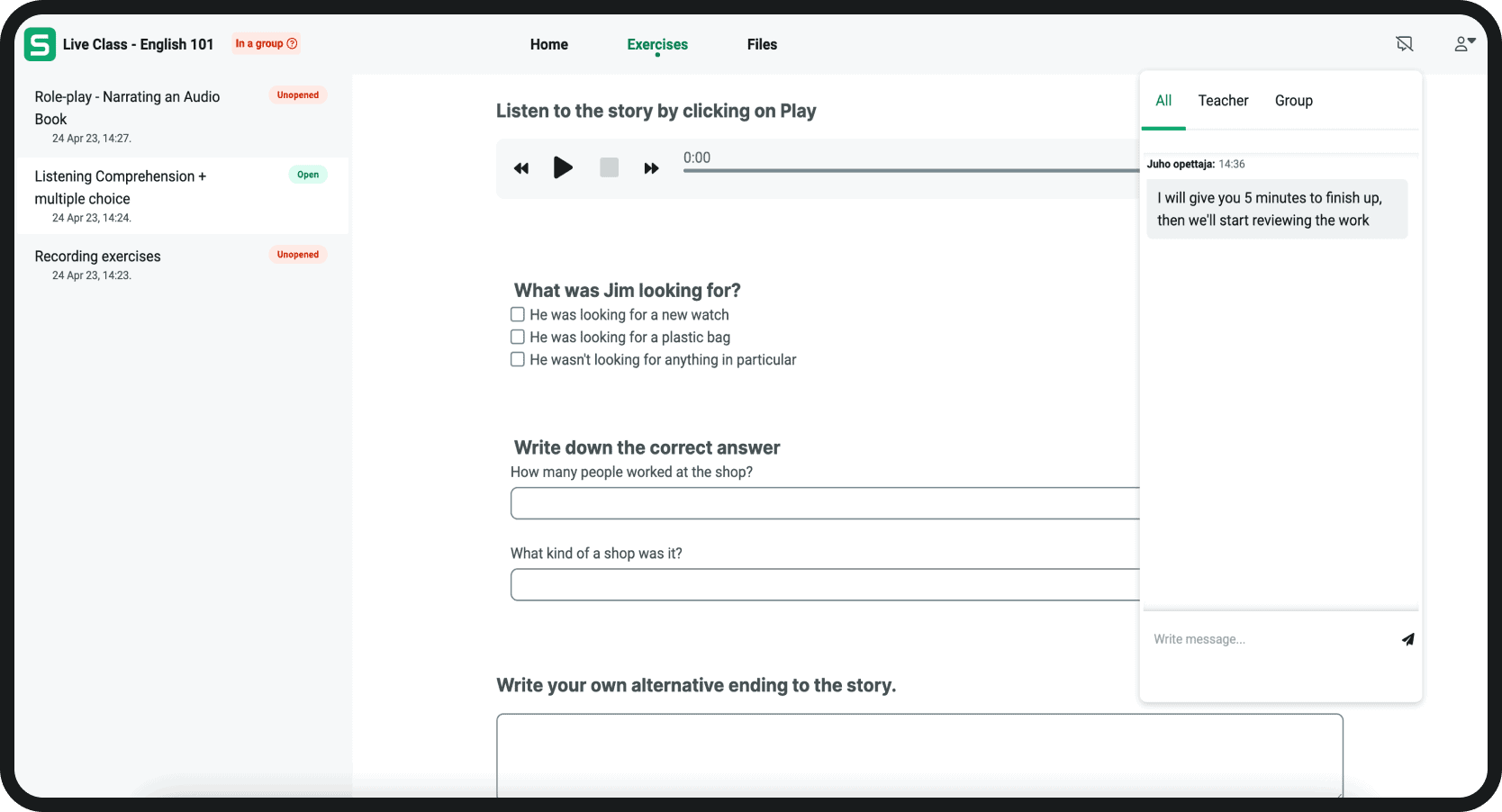 Lancez des activités en direct telles que la discussion en groupes, l’expression orale, l’écoute et la répétition, la description d’image ou tout exercice personnalisé que vous avez créé. Vous pouvez contrôler la lecture du matériel source et enregistrer les productions orales de chaque élève.