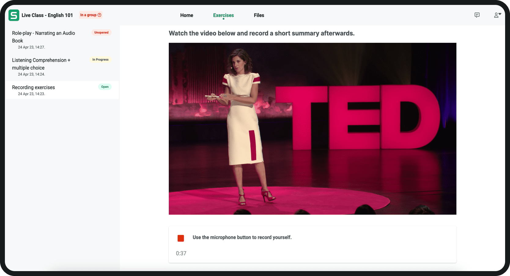 Créez des tâches interactives à l’aide de n’importe quel fichier vidéo ou audio existant et demandez à vos élèves d’effectuer un enregistrement en écoutant le modèle.