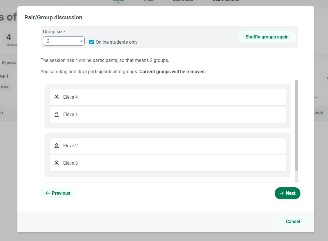 Vous pouvez laisser le choix des participants à Connect en cliquant sur Shuffle groups again ou déplacer les cartes de vos élèves afin de réorganiser vos paires/groupes.