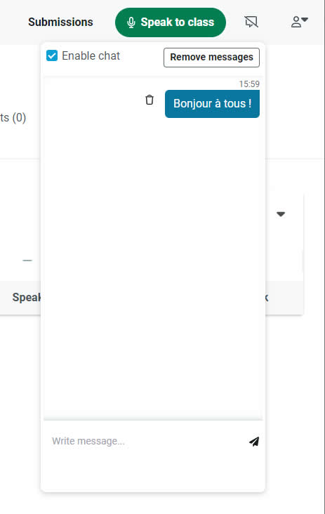 Pour discuter avec tous les élèves, les enseignants peuvent utiliser la fonction de Chat global comme ci-dessous :