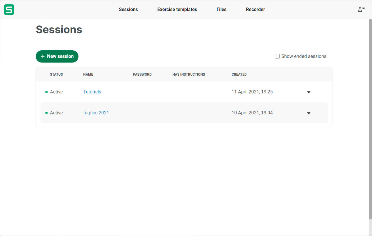 Une fois connecté, vous accédez directement à la page Sessions, où vous pourrez visualiser toutes les sessions que vous avez crées, actives ou terminées. Une « Session » correspond généralement à une classe particulière, vous pouvez donc créer autant de Sessions que vous avez de classes.