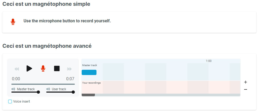 Il existe deux types de Magnétophones : le Magnétophone Simple et le Magnétophone Avancé. Voici à quoi ils ressemblent au sein d’un exercice :
