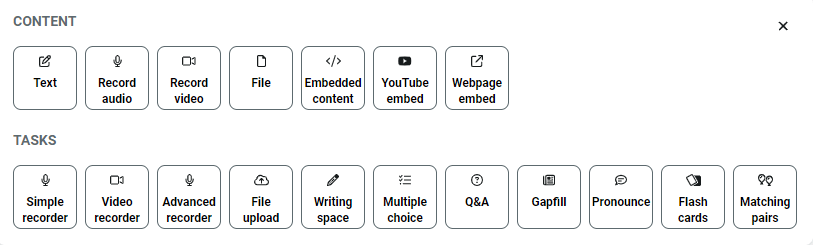 Les exercices de Sanako Connect peuvent être élaborés avec deux types de modules : Contenu et Tâches.