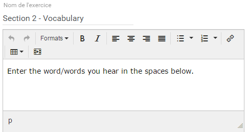 Vous pouvez ensuite définir les différents paramètres de l’exercice. Le champ Durée impartie permet de déterminer si l’exercice aura une durée limitée ou non. Entrez « 0 » si vous désirez ne pas chronométrer l’exercice, sinon saisissez la durée maximale en secondes. Les champs Signet de Démarrage et Signet de Fin vous permettent de ne lire qu’une partie du document audio, compris entre ces deux signets.