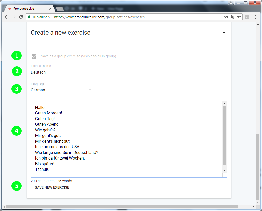 Saisissez ou copiez-collez le texte de l’exercice. Un point suivi d’une lettre majuscule est utilisée pour définir un nouvel élément de prononciation ou une nouvelle phrase. Par exemple, un exercice de prononciation ne contenant que des mots individuels ressemblera à ceci : Chien. Chat. Souris. etc.)