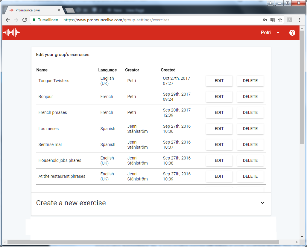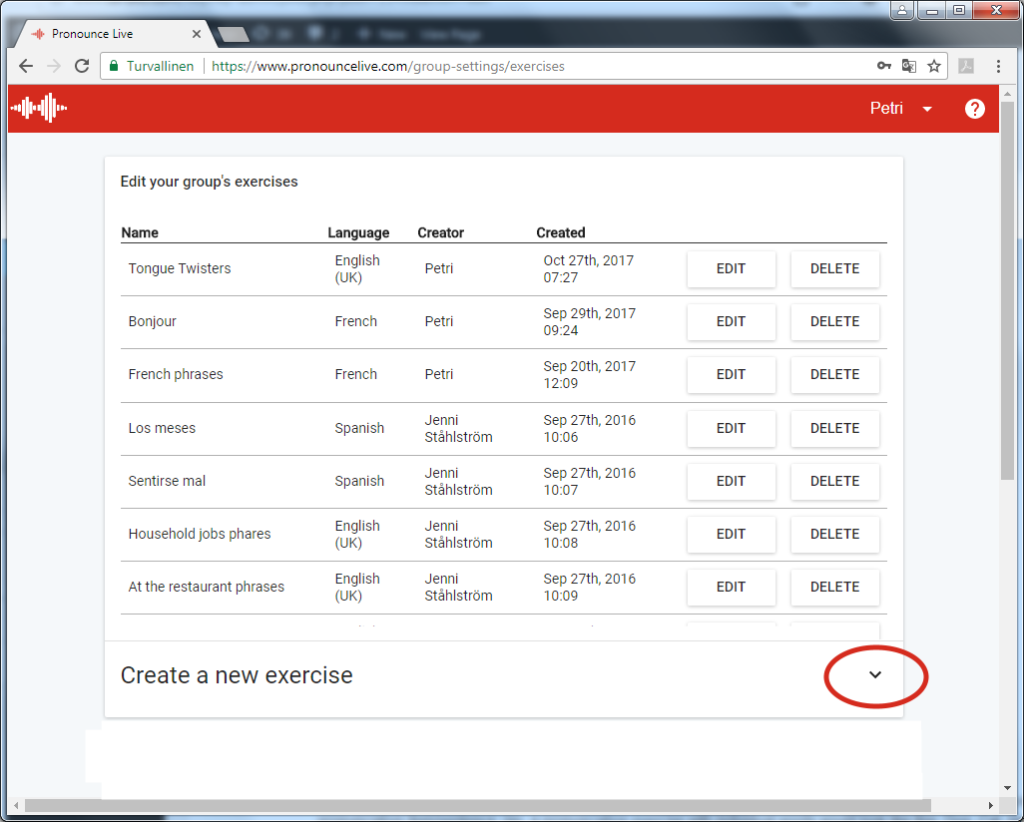 Pour gérer les exercices du groupe, sélectionnez Exercices(Exercises) à partir du menu de Pronounce Live.