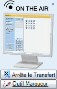 La bannière “On the Air” apparaîtra dans le coin inférieur droit de votre écran. Cette bannière vous permet de mettre fin à la diffusion et d’ajouter des éléments graphiques, grâce à l’Outil Marqueur.