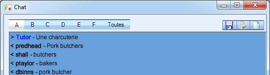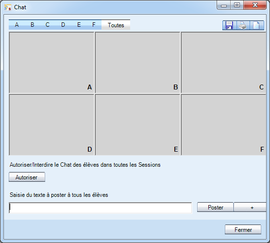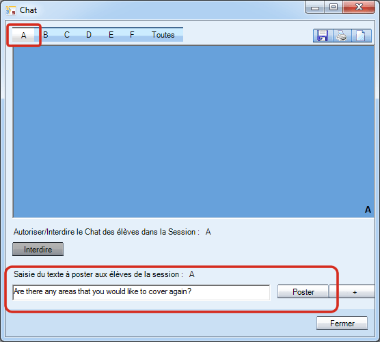 Dès que le professeur clique sur le bouton Autoriser, le Chat devient actif pour la session sélectionnée (ou Toutes les sessions). La couleur de fond de la fenêtre de Chat change selon la couleur du groupe.