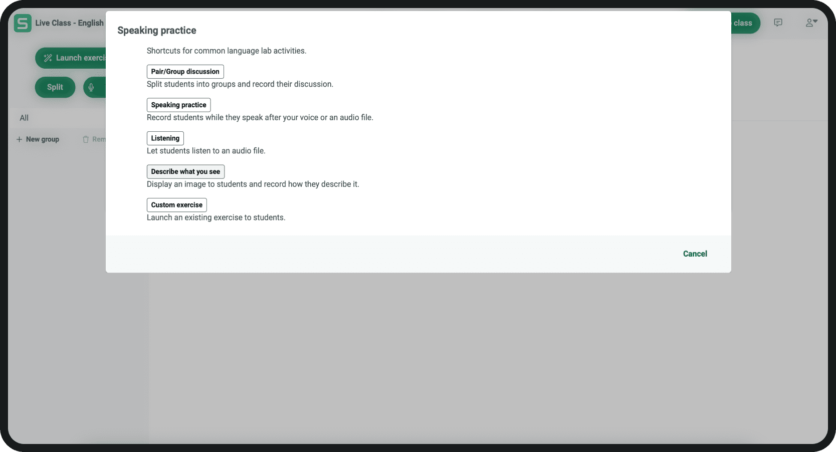 Lancez des activités en direct telles que la discussion en groupes, l’expression orale, l’écoute et la répétition, la description d’image ou tout exercice personnalisé que vous avez créé. Vous pouvez contrôler la lecture du matériel source et enregistrer les productions orales de chaque élève.